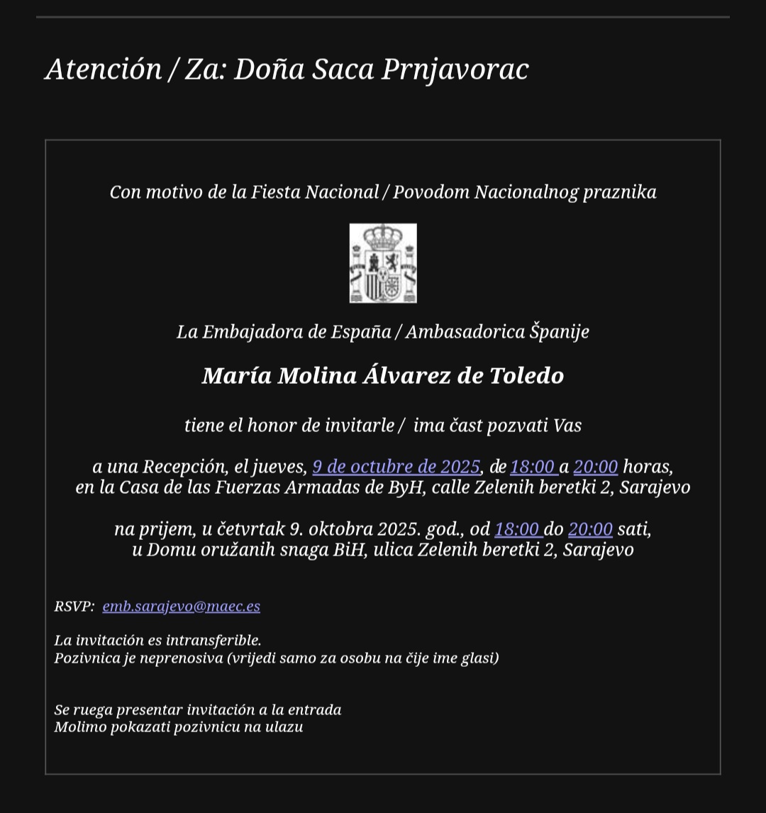 Predsjednica Udruženja privrednika „Biznis centar“ Jelah-Tešanj, gospođa Saca Prnjavorac, jučer je prisustvovala svečanom prijemu koji je organizovala ambasadorica Španije, Nj. E. María Molina Álvarez de Toledo, povodom obilježavanja Nacionalnog praznika Kraljevine Španije.